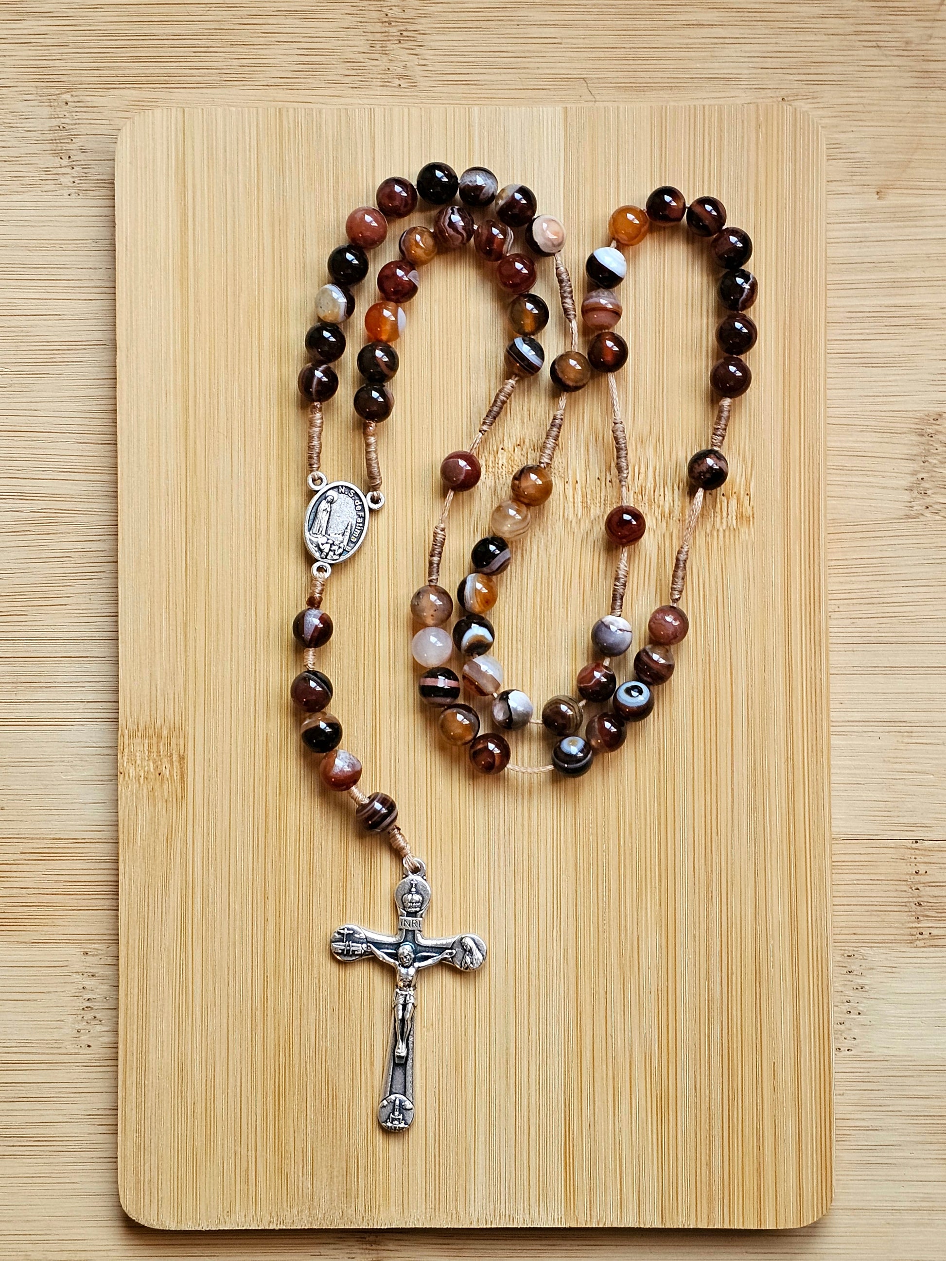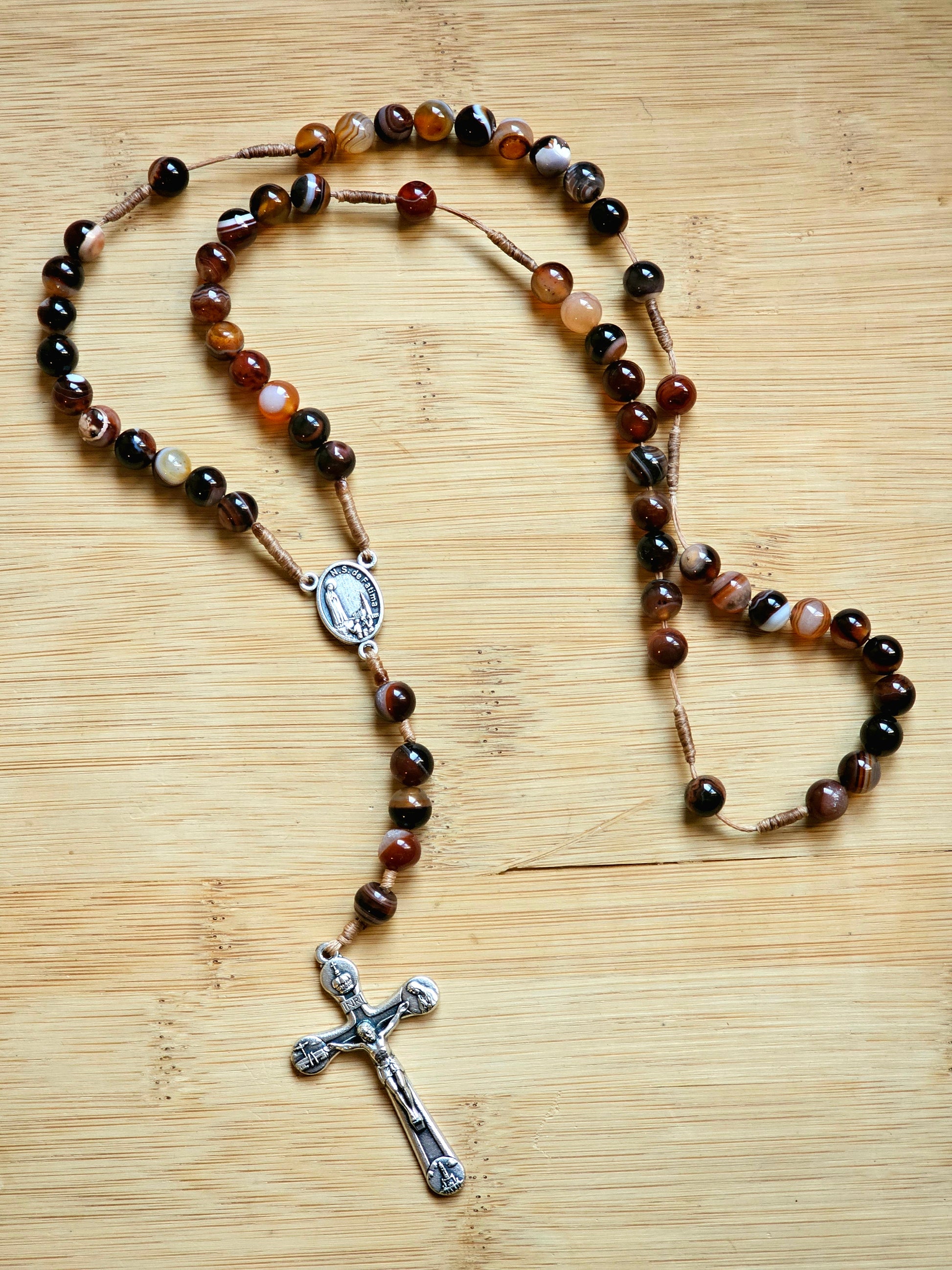 Terço artesanal, feito em cordão e pedras naturais agata castanha de 8mm (este terço pode ser usado ao pescoço)