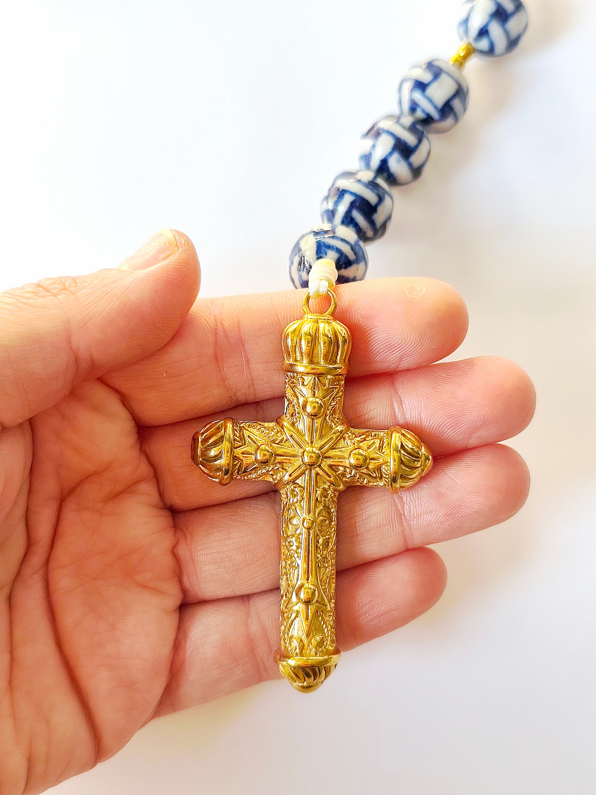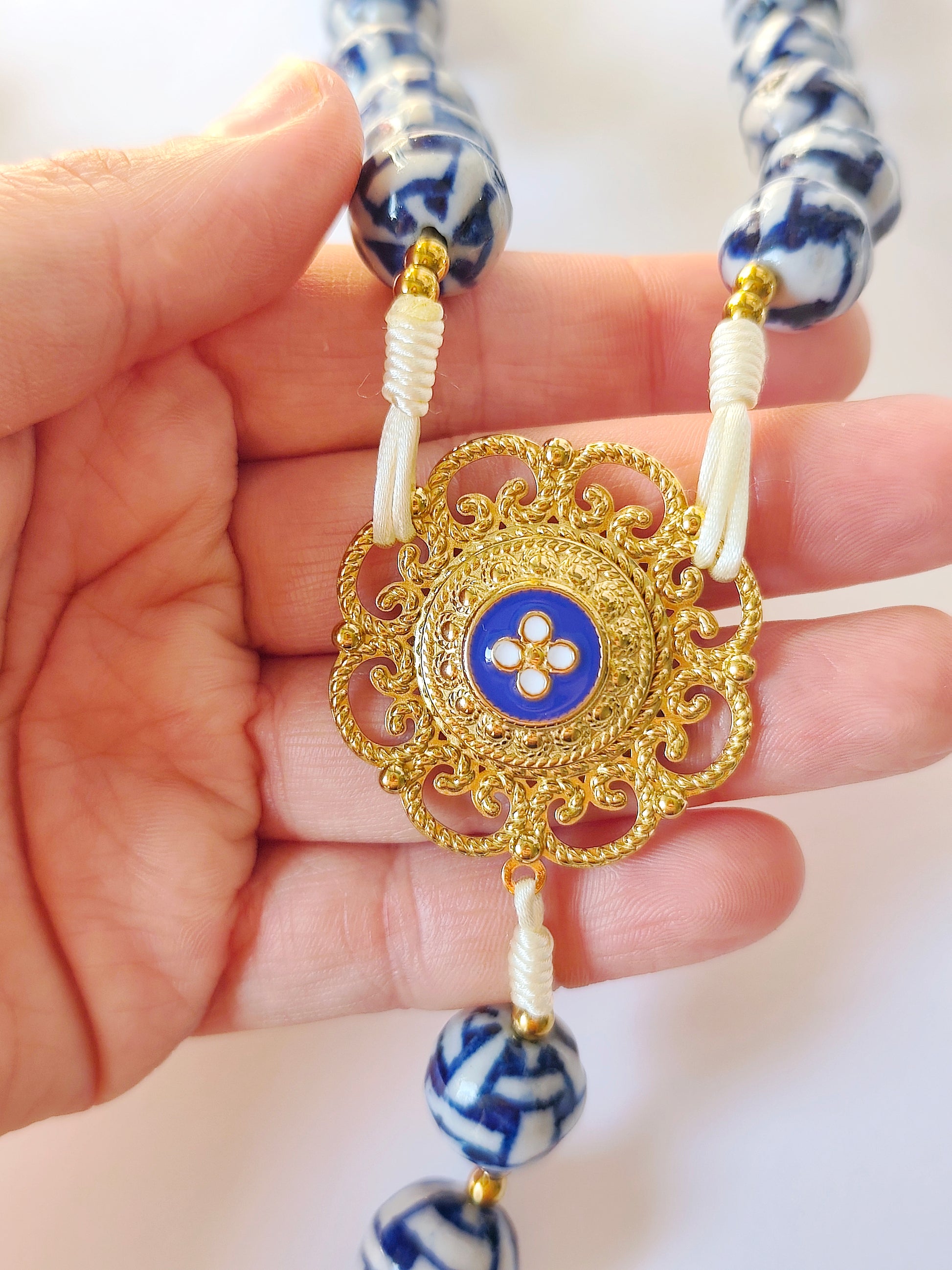 O toque da porcelana que faz lembrar os azulejos portugueses, a mandala de filigrana com a flor portuguesa e a cruz que nos remete ao tempo dos reis.