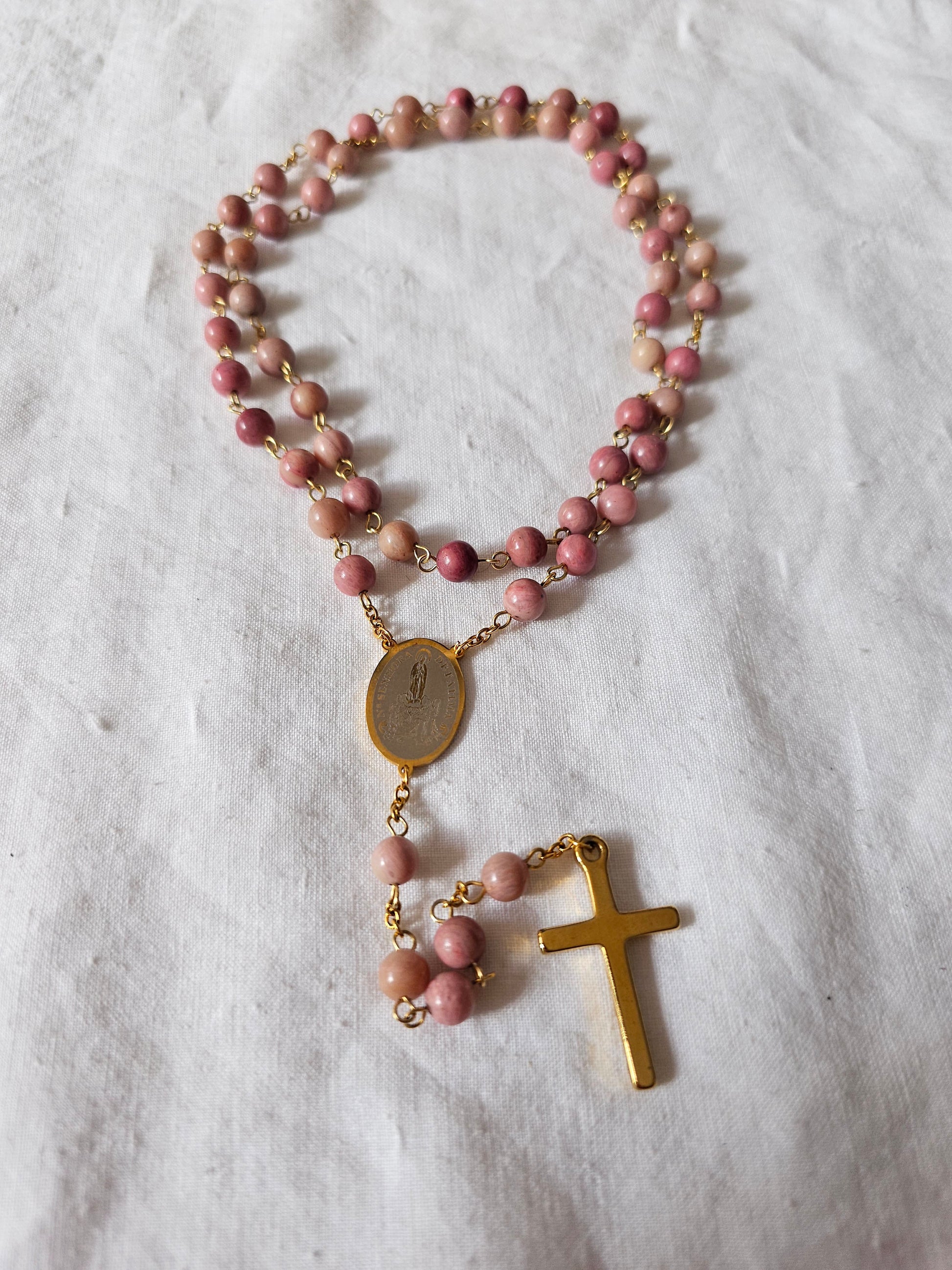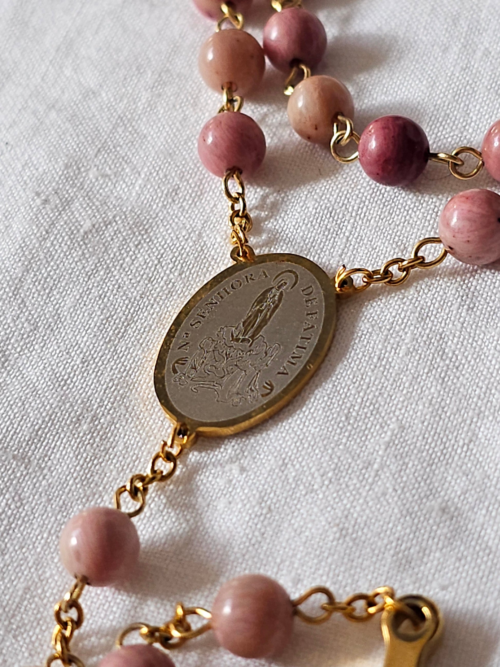 A Rodonite é conhecida por promover o amor, a compaixão e o perdão, além de ajudar a curar feridas emocionais e a estabilizar sentimentos. Usar um terço feito desta pedra pode intensificar a oração, trazendo um senso de paz e equilíbrio ao coração e à mente.